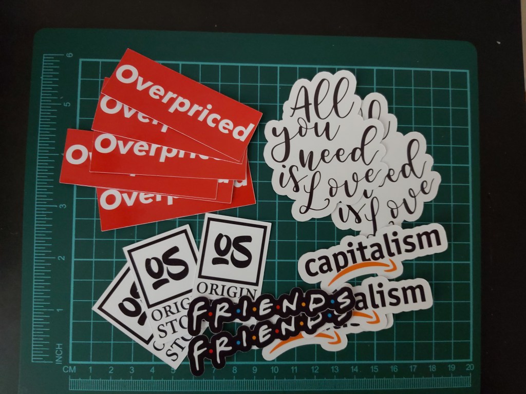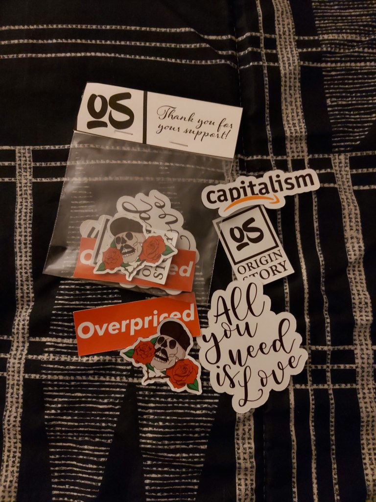 Origin Story Apparel Stickers with packaging